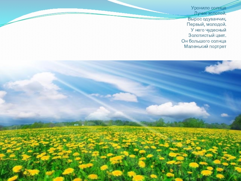 Слайд 5 Уронило солнце Лучик золотой. Вырос одуванчик, Первый, молодой. У него чудесный Золотистый цвет. Он большого солнца Маленький портрет