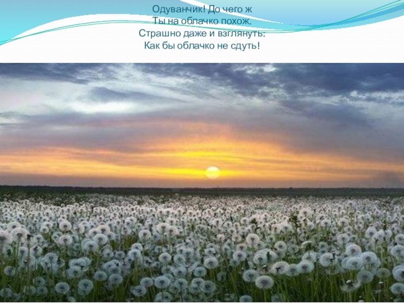 Слайд 6Одуванчик! До чего ж Ты на облачко похож. Страшно даже и взглянуть: Как бы