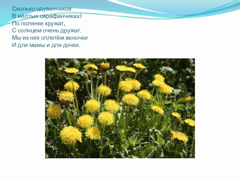 Слайд 2Сколько одуванчиков В жёлтых сарафанчиках! По полянке кружат, С солнцем очень дружат. Мы из них