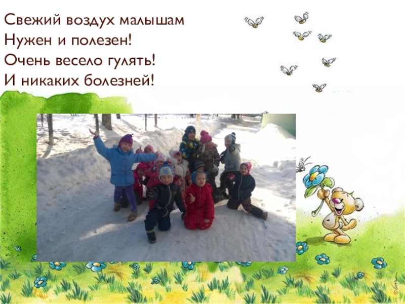 Слайд 11Свежий воздух малышам Нужен и полезен! Очень весело гулять! И никаких болезней!