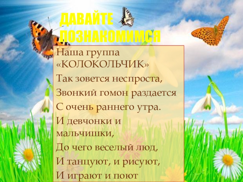 ДАВАЙТЕ ПОЗНАКОМИМСЯНаша группа «КОЛОКОЛЬЧИК»Так зовется неспроста,Звонкий гомон раздаетсяС очень раннего утра.И девчонки и мальчишки,До чего веселый люд,И