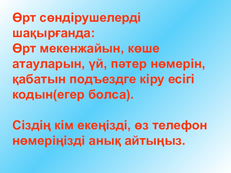 Өрт сөндірушелерді шақырғанда:Өрт мекенжайын, көше атауларын, үй, пәтер нөмерін, қабатын подъездге кіру есігі кодын(егер болса).Сіздің кім екеңізді,