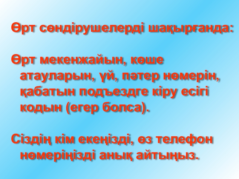 Өрт сөндірушелерді шақырғанда:Өрт мекенжайын, көше атауларын, үй, пәтер нөмерін, қабатын подъездге кіру есігі кодын (егер болса).Сіздің кім