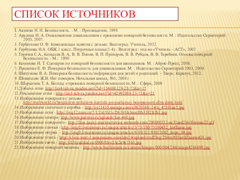 7. Прилепко Е. Ф. Пожарная безопасность для дошкольников. М. : Издательство Скрипторий 2003, 2009.
