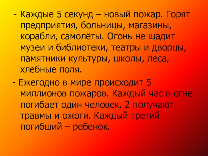 - Ежегодно в мире происходит 5 миллионов пожаров. Каждый час в огне погибает один человек, 2 получают травмы и ожоги. Каждый третий погибший – ребенок.