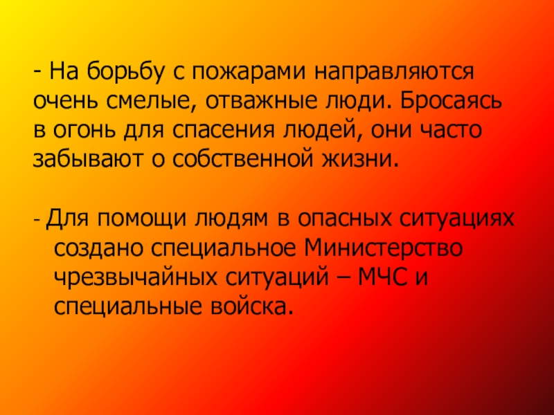 - На борьбу с пожарами направляются очень смелые, отважные люди. Бросаясь