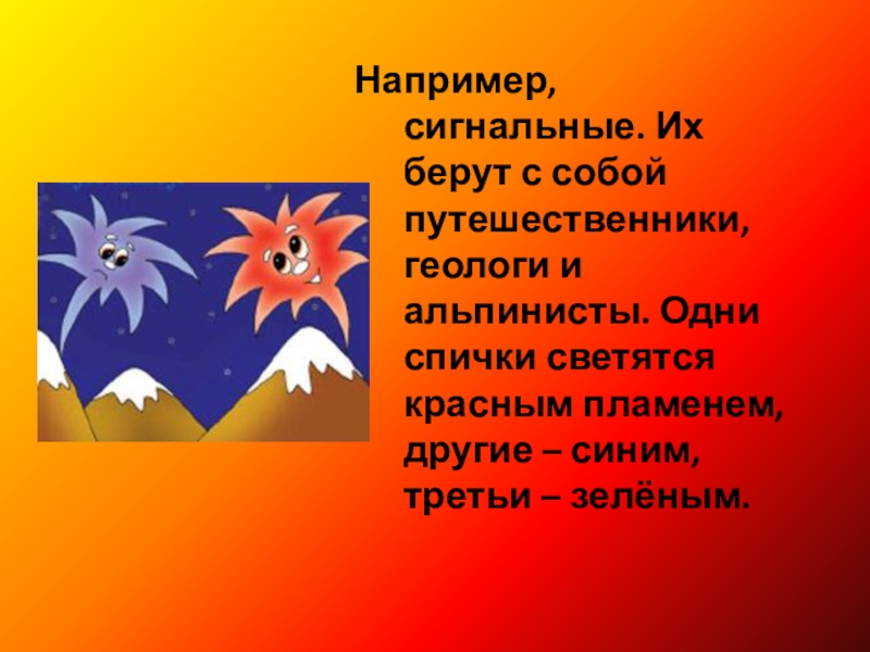 Слайд 11Например, сигнальные. Их берут с собой путешественники, геологи и альпинисты. Одни