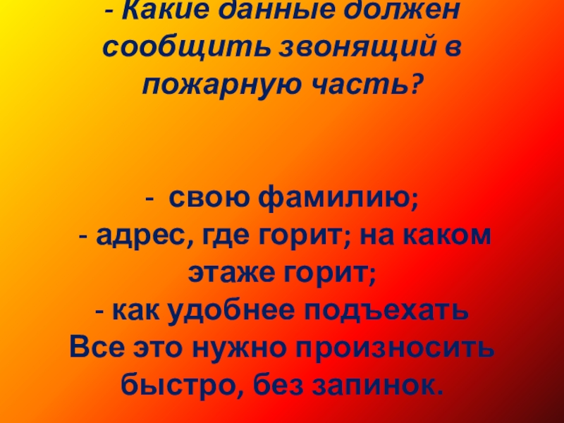 - Какие данные должен сообщить звонящий в пожарную часть?