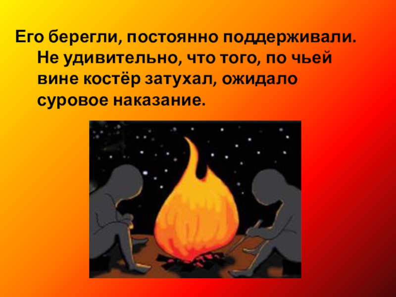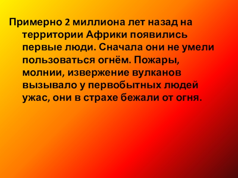Сначала они не умели пользоваться огнём. Пожары, молнии, извержение вулканов вызывало у первобытных людей ужас, они в страхе бежали от огня.