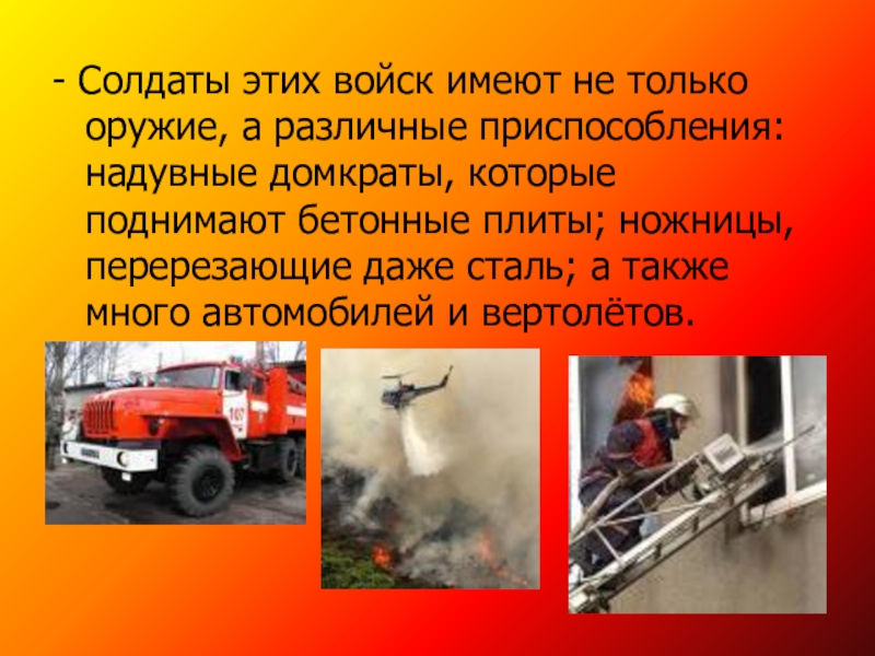 надувные домкраты, которые поднимают бетонные плиты; ножницы, перерезающие даже сталь; а также много автомобилей и вертолётов.
