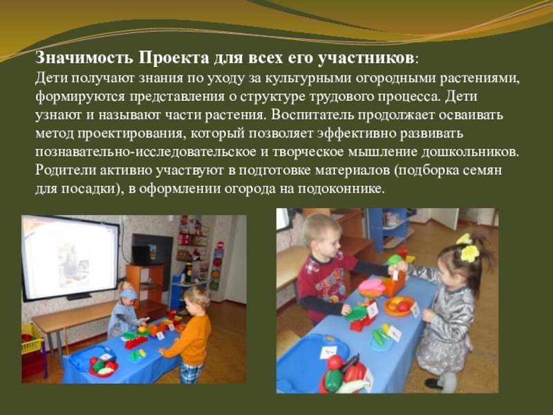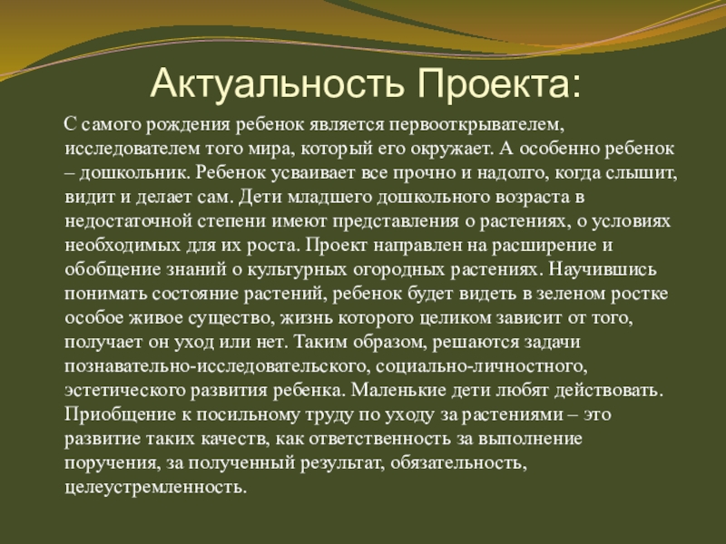 мира, который его окружает. А особенно ребенок – дошкольник. Ребенок усваивает все прочно и надолго, когда слышит, видит и делает сам. Дети младшего дошкольного возраста в недостаточной степени имеют представления о растениях, о условиях необходимых для их роста. Проект направлен на расширение и обобщение знаний о культурных огородных растениях. Научившись понимать состояние растений, ребенок будет видеть в зеленом ростке особое живое существо, жизнь которого целиком зависит от того, получает он уход или нет. Таким образом, решаются задачи познавательно-исследовательского, социально-личностного, эстетического развития ребенка. Маленькие дети любят действовать. Приобщение к посильному труду по уходу за растениями – это развитие таких качеств, как ответственность за выполнение поручения, за полученный результат, обязательность, целеустремленность.