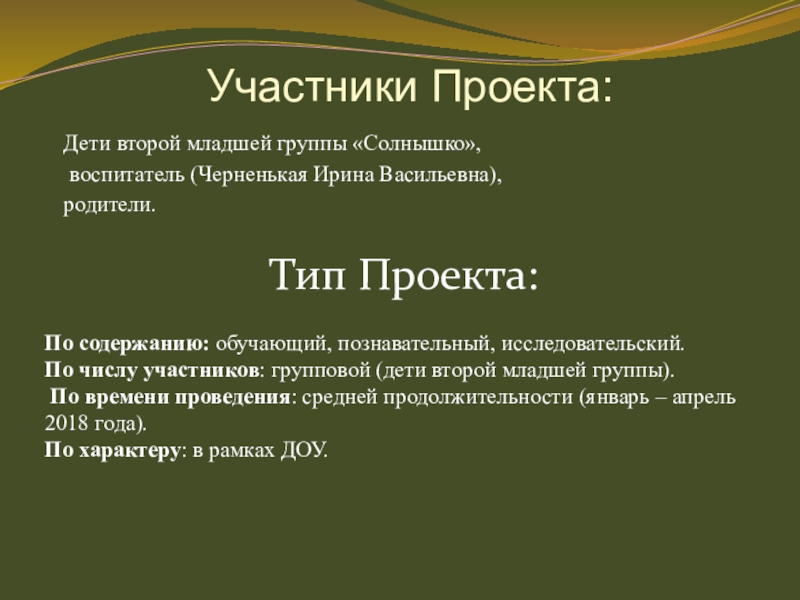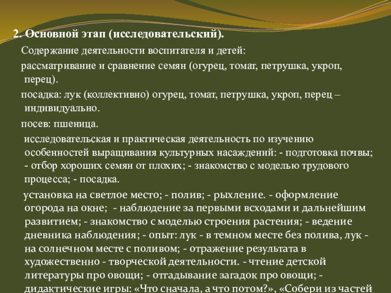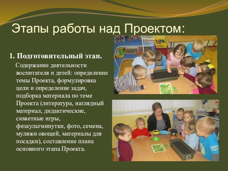 и детей: определение темы Проекта, формулировка цели и определение задач, подборка материала по теме Проекта (литература, наглядный материал, дидактические, сюжетные игры, физкультминутки, фото, семена, муляжи овощей, материалы для посадки), составление плана основного этапа Проекта.