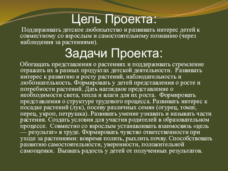 Обогащать представления о растениях и поддерживать стремление отражать их в разных продуктах детской деятельности. Развивать интерес к развитию и росту растений, наблюдательность и любознательность. Формировать у детей представления о росте и потребности растений. Дать наглядное представление о необходимости света, тепла и влаги для их роста. Формировать представления о структуре трудового процесса. Развивать интерес к посадке растений (лук), посеву различных семян (огурец, томат, перец, укроп, петрушка). Развивать умение узнавать и называть части растения. Создать условия для участия родителей в образовательном процессе. Совместно со взрослым устанавливать взаимосвязь «цель — результат» в труде. Формировать чувство ответственности при уходе за растениями: вовремя полить, рыхлить почву. Способствовать развитию самостоятельности, уверенности, положительной самооценки. Вызвать радость у детей от полученных результатов.