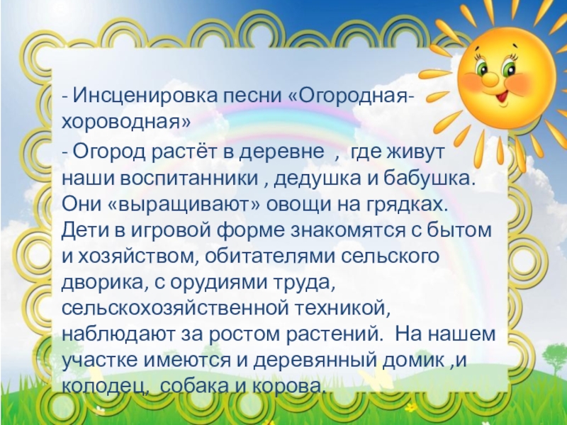 где живут наши воспитанники , дедушка и бабушка. Они «выращивают» овощи на грядках. Дети в игровой форме знакомятся с бытом и хозяйством, обитателями сельского дворика, с орудиями труда, сельскохозяйственной техникой, наблюдают за ростом растений. На нашем участке имеются и деревянный домик ,и колодец, собака и корова.