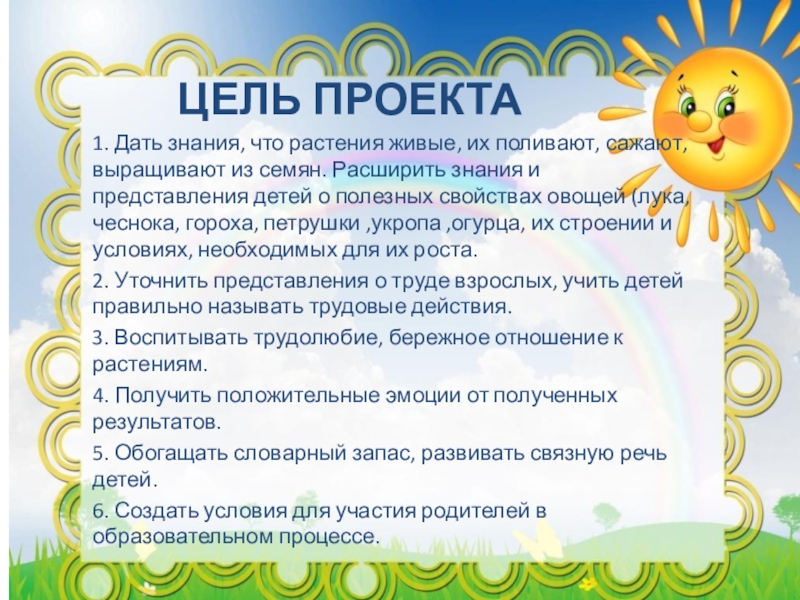 1. Дать знания, что растения живые, их поливают, сажают, выращивают