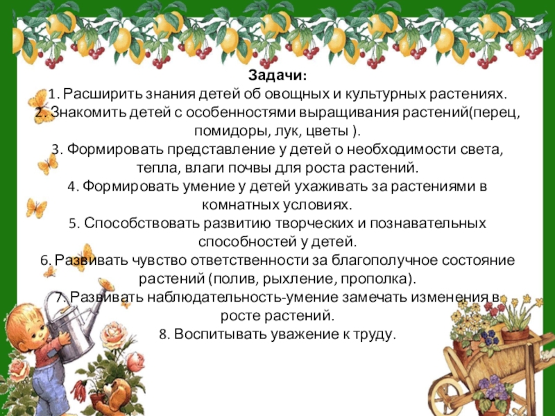 Задачи: 1. Расширить знания детей об овощных и культурных растениях. 2. Знакомить