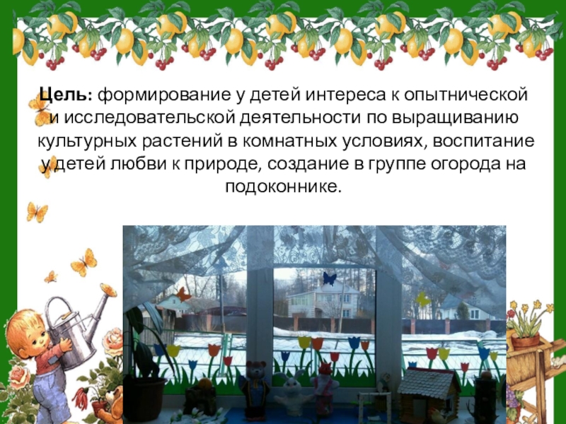 выращиванию культурных растений в комнатных условиях, воспитание у детей любви к природе, создание в группе огорода на подоконнике.