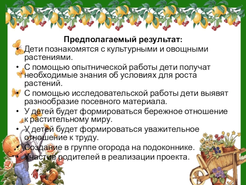 Предполагаемый результат:Дети познакомятся с культурными и овощными растениями.С помощью опытнической работы дети получат необходимые знания об условиях
