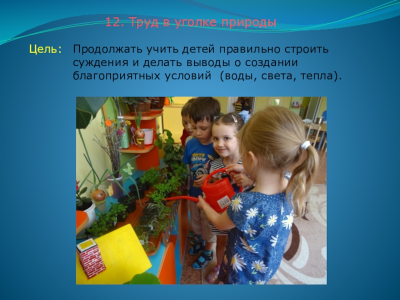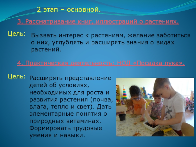 Расширять представление детей об условиях, необходимых для роста и развития растения (почва, влага, тепло и свет). Дать элементарные понятия о природных витаминах. Формировать трудовые умения и навыки.