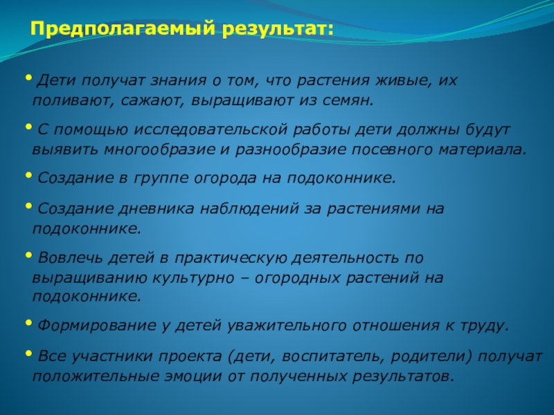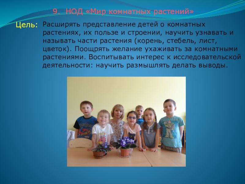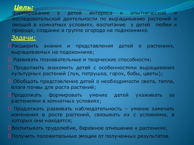 Расширить знания и представления детей о растениях, выращиваемых на подоконнике;