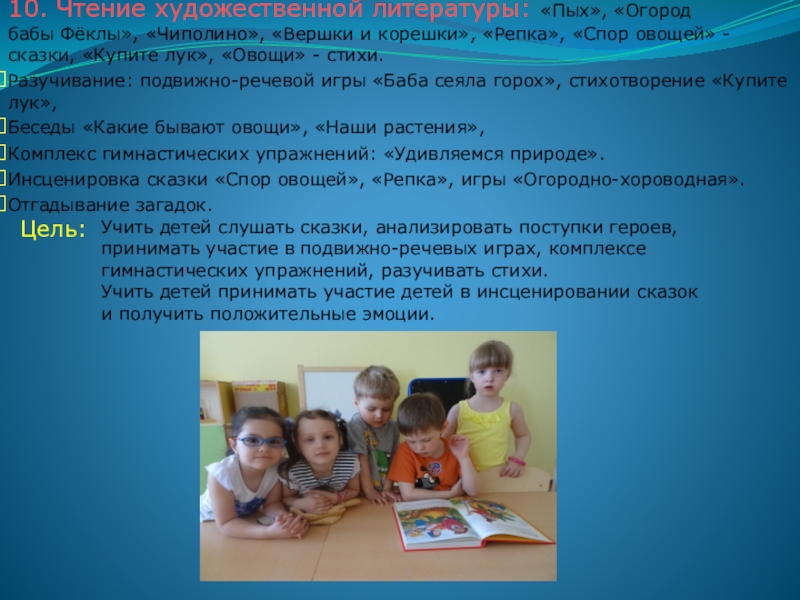 Учить детей слушать сказки, анализировать поступки героев, принимать участие в подвижно-речевых играх, комплексе гимнастических упражнений, разучивать стихи.