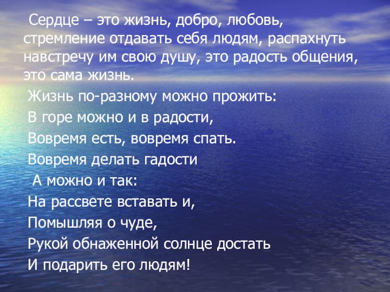 Слайд 32 Сердце – это жизнь, добро, любовь, стремление отдавать себя людям,