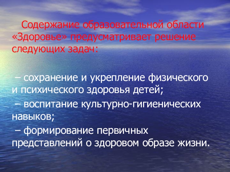 Слайд 7 Содержание образовательной области «Здоровье» предусматривает решение следующих задач: