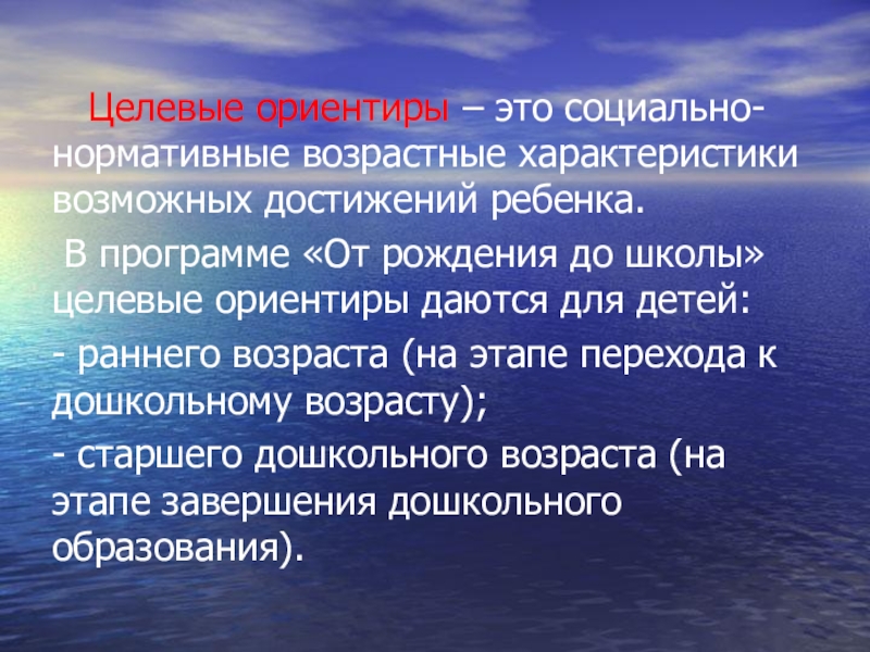 Слайд 8 Целевые ориентиры – это социально-нормативные возрастные характеристики возможных достижений