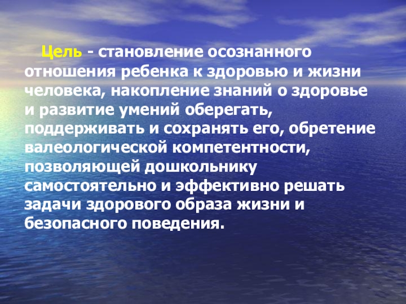 здоровью и жизни человека, накопление знаний о здоровье и развитие умений оберегать, поддерживать и сохранять его, обретение валеологической компетентности, позволяющей дошкольнику самостоятельно и эффективно решать задачи здорового образа жизни и безопасного поведения.