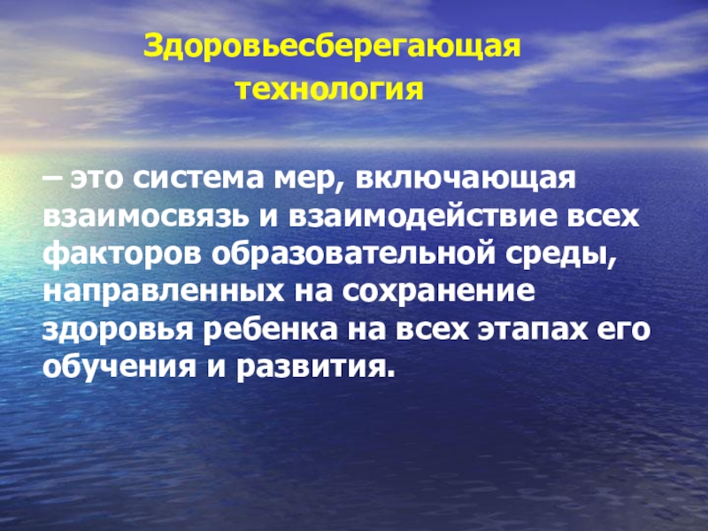 – это система мер, включающая взаимосвязь и взаимодействие всех факторов образовательной среды, направленных на сохранение здоровья ребенка на всех этапах его обучения и развития.