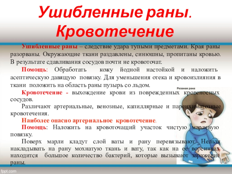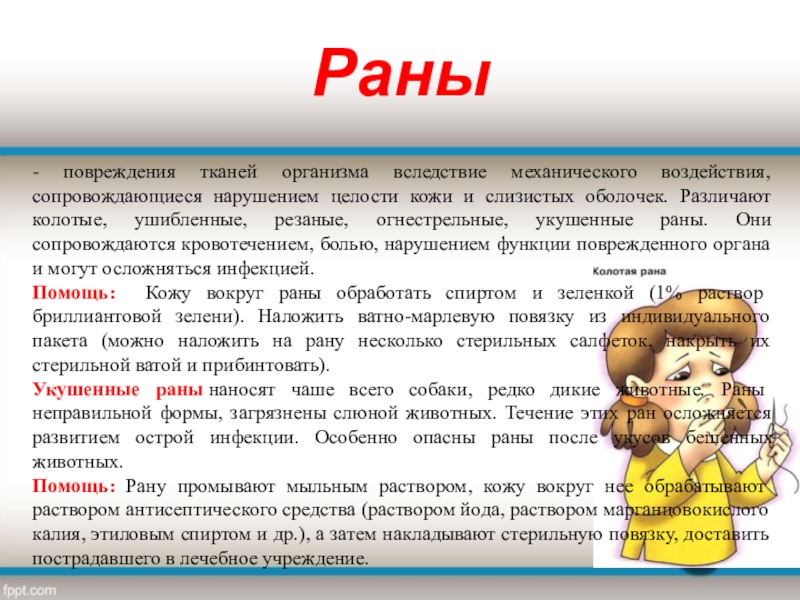 и слизистых оболочек. Различают колотые, ушибленные, резаные, огнестрельные, укушенные раны. Они сопровождаются кровотечением, болью, нарушением функции поврежденного органа и могут осложняться инфекцией.