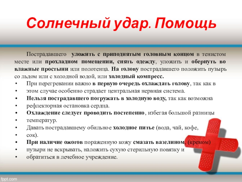 Помощь: Пострадавшего уложить с приподнятым головным концом в тенистом месте или прохладном помещении, снять одежду, уложить и обернуть во влажные простыни или полотенца. На голову пострадавшего положить пузырь со льдом или с холодной водой, или холодный компресс.