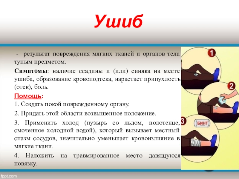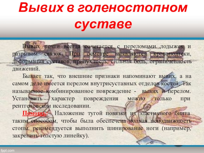 Помощь: Наложение тугой повязки из эластичного бинта таким способом, чтобы была обеспечена полная неподвижность стопы. рекомендуется выполнить шинирование ноги (например, закрепить толстую линейку).