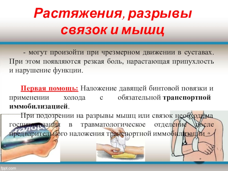 При подозрении на разрывы мышц или связок необходима госпитализация в травматологическое отделение после предварительного наложения транспортной иммобилизации
