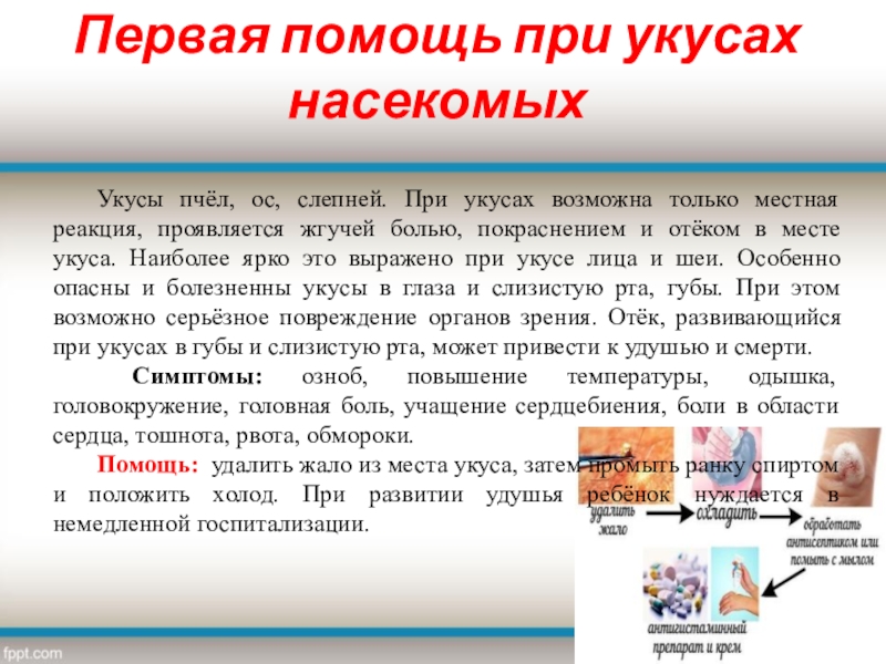 Помощь: удалить жало из места укуса, затем промыть ранку спиртом и положить холод. При развитии удушья ребёнок нуждается в немедленной госпитализации.