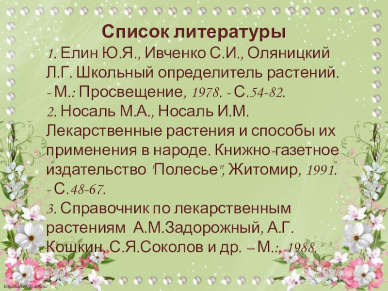 1. Елин Ю.Я., Ивченко С.И., Оляницкий Л.Г. Школьный определитель растений.
