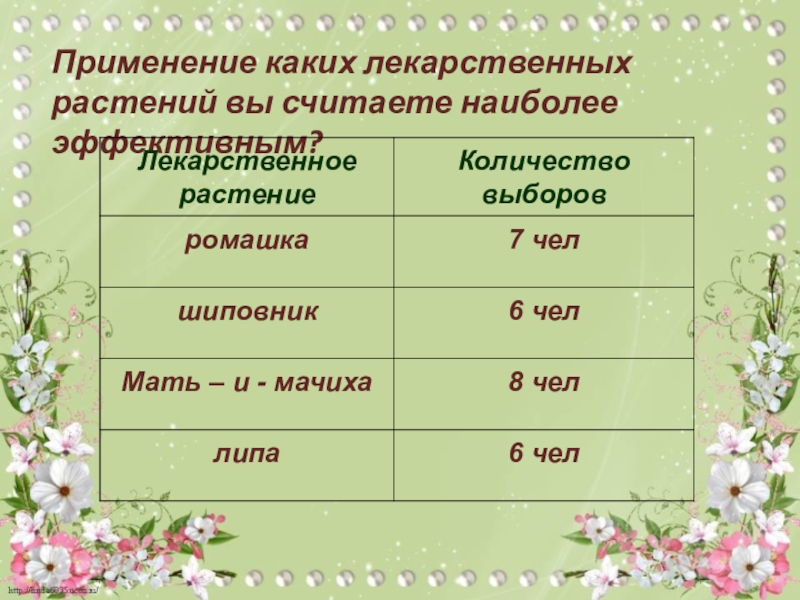 Слайд 16Применение каких лекарственных растений вы считаете наиболее эффективным?