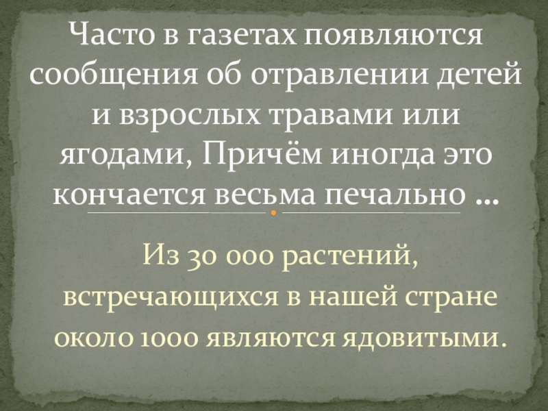 Часто в газетах появляются сообщения об отравлении детей и взрослых травами или ягодами, Причём иногда это кончается весьма печально …