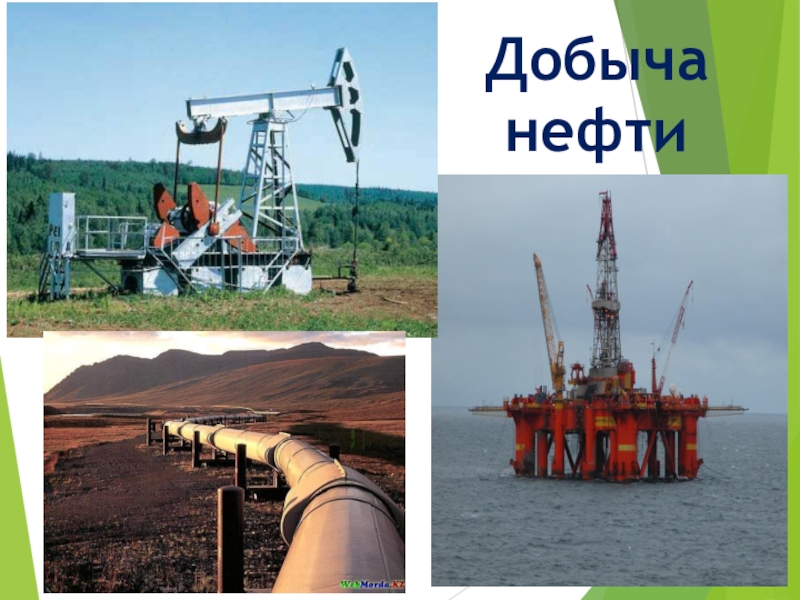 Для добычи нефти строят буровые вышки , бурят глубокие скважины, выкачивают её мощными насосами.