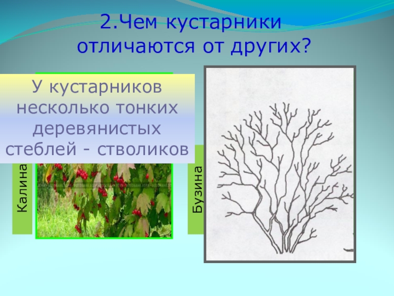 2.Чем кустарники отличаются от других?КалинаБузинаУ кустарниковнесколько тонкихдеревянистыхстеблей - стволиков