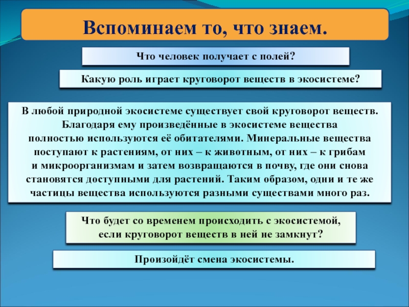 В любой природной экосистеме существует свой круговорот веществ. Благодаря ему произведённые в экосистеме вещества