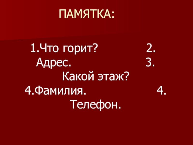 ПАМЯТКА: 1.Что горит?       2.Адрес.