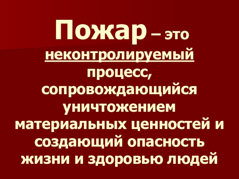 Пожар – это неконтролируемый процесс, сопровождающийся уничтожением материальных ценностей и создающий опасность жизни и здоровью людей