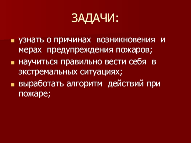 ЗАДАЧИ:узнать о причинах возникновения и мерах предупреждения пожаров;научиться правильно вести себя в экстремальных ситуациях;выработать алгоритм действий при
