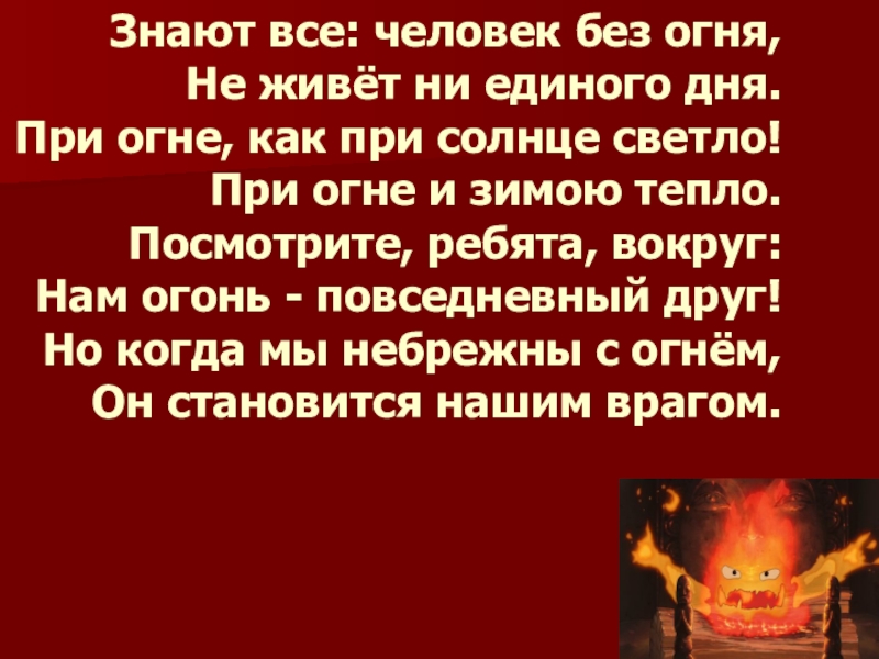 при солнце светло! При огне и зимою тепло. Посмотрите, ребята, вокруг: Нам огонь - повседневный друг! Но когда мы небрежны с огнём, Он становится нашим врагом.