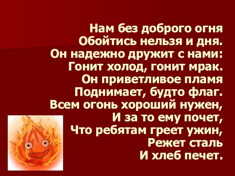 Нам без доброго огня Обойтись нельзя и дня. Он надежно дружит с нами: Гонит холод, гонит мрак.