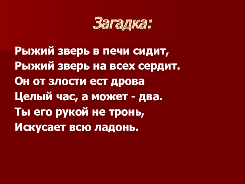 Загадка:Рыжий зверь в печи сидит,Рыжий зверь на всех сердит.Он от злости ест дроваЦелый час, а может - два.Ты его рукой не тронь,Искусает всю ладонь.