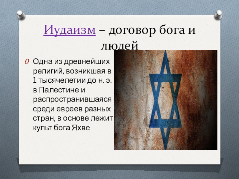 1 тысячелетии до н. э. в Палестине и распространившаяся среди евреев разных стран, в основе лежит культ бога Яхве
