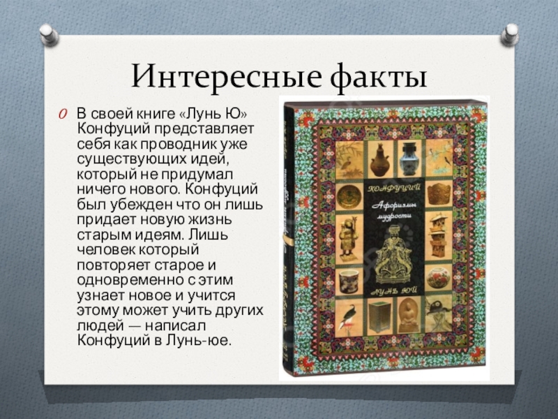 уже существующих идей, который не придумал ничего нового. Конфуций был убежден что он лишь придает новую жизнь старым идеям. Лишь человек который повторяет старое и одновременно с этим узнает новое и учится этому может учить других людей — написал Конфуций в Лунь-юе.