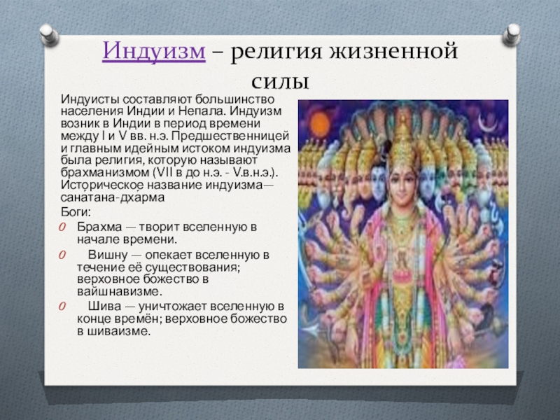 Индуизм возник в Индии в период времени между I и V вв. н.э. Предшественницей и главным идейным истоком индуизма была религия, которую называют брахманизмом (VII в до н.э. - V.в.н.э.). Историческое название индуизма— сана́тана-дха́рма